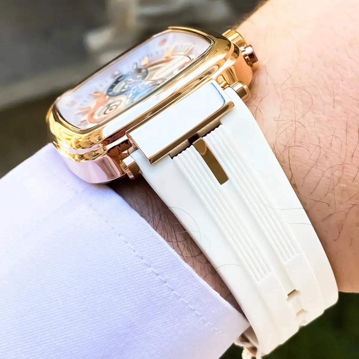 Feito para acompanhar seu ritmo, ele combina pulseira de silicone de alta durabilidade com um corpo leve e resistente — perfeito para o dia a dia dinâmico e para momentos casuais com elegância.